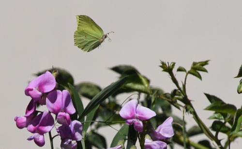 Cet été, un papillon jaune nommé « citron » voulait butiner des pois de senteurs dans mon jardin …
