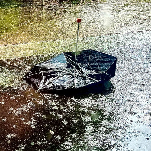 Après m’avoir lâché la main ce parapluie capricieux s’est envolé avant de retomber en tourniquant pour enfin se stabiliser sur ce sol étonnant.